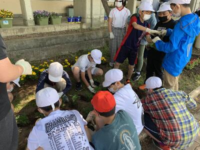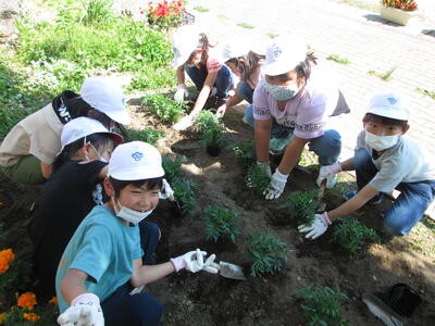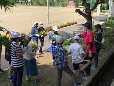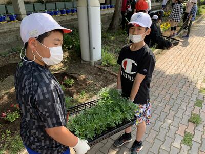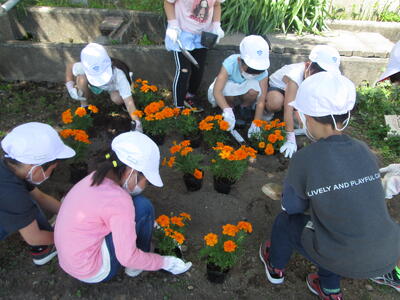 5,6年生が自分たちの花壇にマリーゴールドを植えました