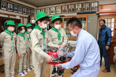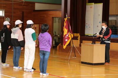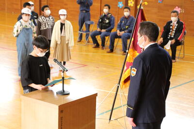 避難訓練後には、町消防団代表、消防署の皆さまと一緒に、少年消防クラブの結団式を行いました