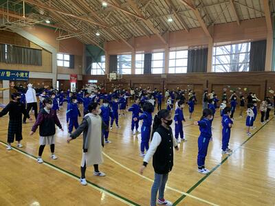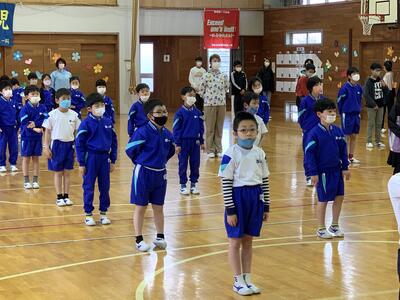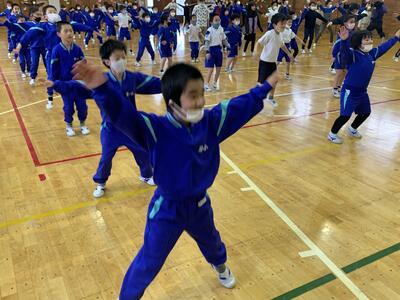 朝からあいにくの雨でしたが、体育館で2~6年生がラジオ体操を行いました