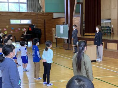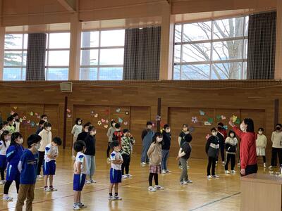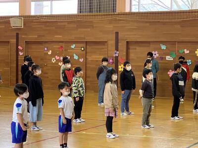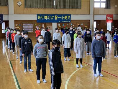 1年生はまだですが、2~6年生がそろってはじめての全校朝の会でした