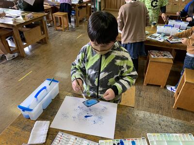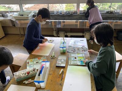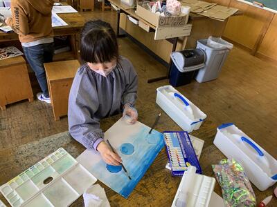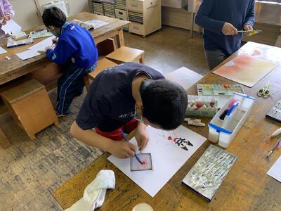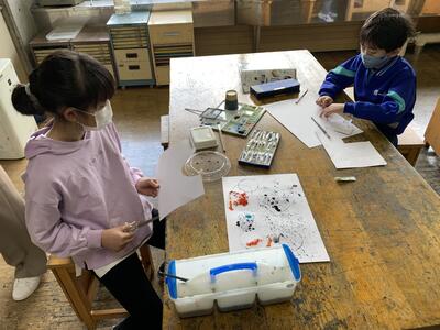4年生が図工の時間に、いろいろな道具を使った絵にチャレンジしていました
