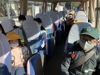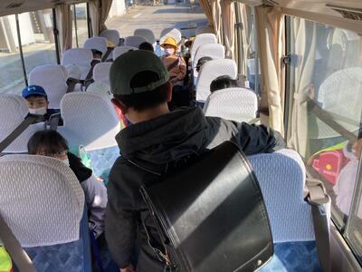 バスの中で、6年生の班長が一人一人のシートベルトを確認し、声かけをしてくれています