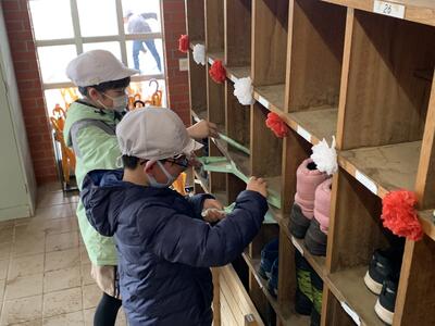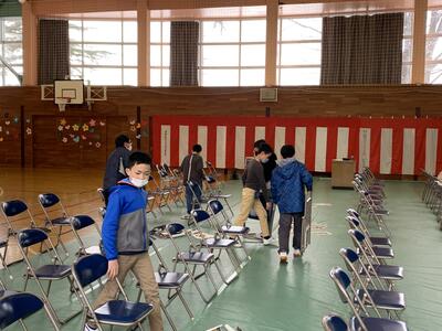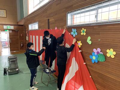 明日はいよいよ、卒業式放課後に、5年生と先生方で会場作成を行いました