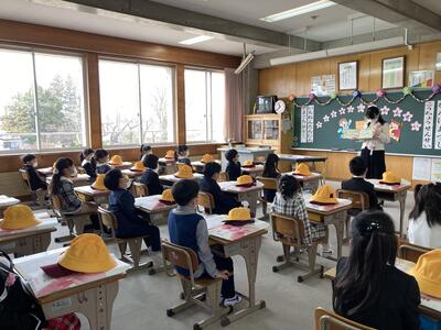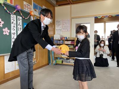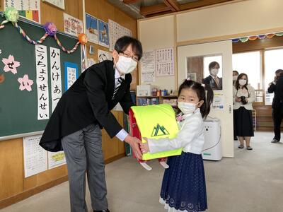 そして、教科書、交通安全協会、交通安全母の会からいただいた、黄色い帽子、ランドセルカバーが校長先生から渡されました大事に使ってほしいと思います