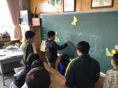 黒板に何を書いたか、クイズをしています「名探偵」ゲームで盛り上がりました