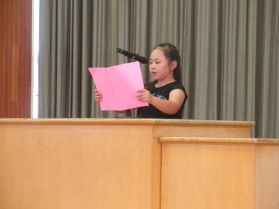 2年代表児童が、1学期にがんばったことを、はっきりとした声で発表しました。