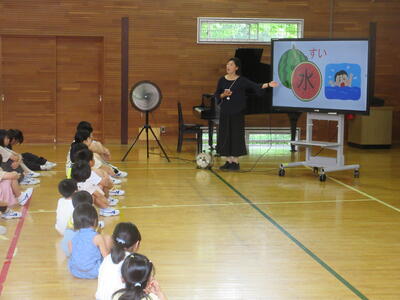 スクリーンを用い、わかりやすい合言葉「すいかにんじゃ」や健康クイズなどで説明しました。
