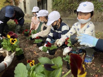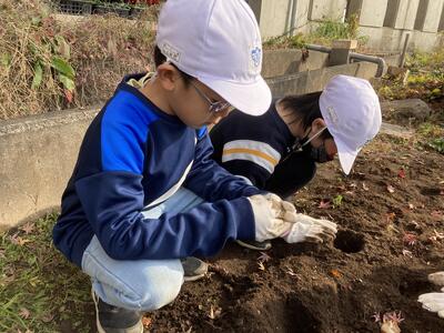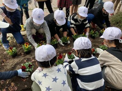 4年生が朝の時間を使って、パンジーの苗とチューリップの球根を植えてくれました