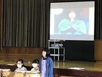 まず初めに、昨年度12月~2月の間、民話語りの会「ゆずりは」の方々にご指導いただいた“民話の語り”を紙芝居とともに発表しました。発表したのは「うりひめご」と「方目っこのじいさま」。すてきな民話の世界が版画で作った絵と一緒に全校性に届けられました。