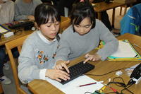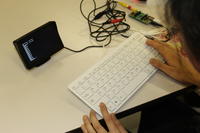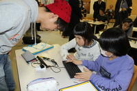 子どもたちは、初めに簡単なコマンドについて練習しながら、LEDを点灯させるプログラミングについて学習しました。次に、プログラミングの基本について知った上で、主人公が障害物を避けながら移動するゲーム作りを行いました。