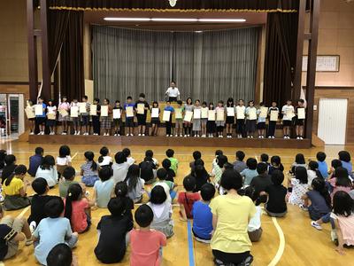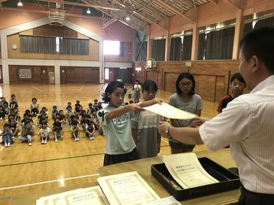 23日の始業式では、町水泳交歓会の入賞者の表彰を行いました。5・6年生のたくさんの頑張りに、全校児童からも大きな拍手がおくられました。