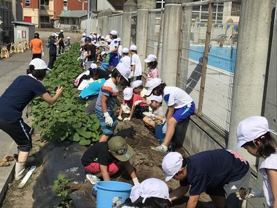 子どもたちは友だちと協力し合ったり、上級生に手助けしてもらったりしながら、じゃがいもを傷つけないよう注意して掘り出しました。