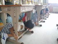 放送の指示で、身を守るための3つの行動「1.まず低く」「2.頭を守る」「3.動かない」を実際にとりながら、地震発生の際の身を守る行動を確認しました。