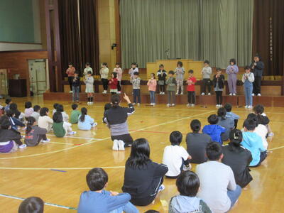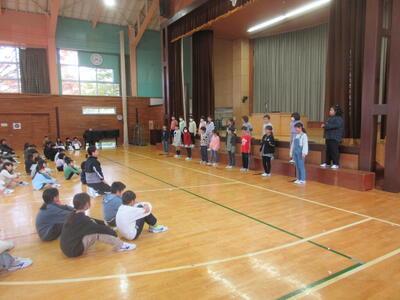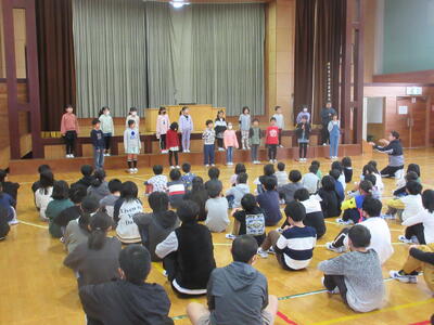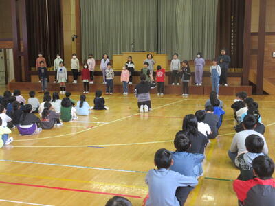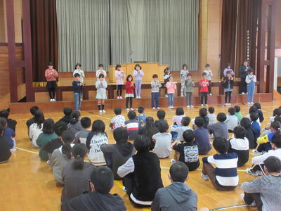 本日の全校朝の会は、3年生の表現活動を行いました。