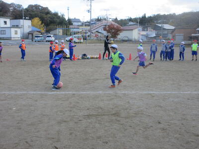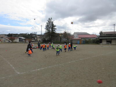 ボールに親しむ運動から、1対1、2対2、最後はチーム対抗のゲームまでできました。