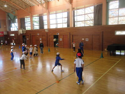 1~6年生まで一緒なので、上学年は「利き手と逆の手でボールを投げる」という特別ルールにしました。