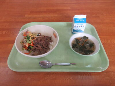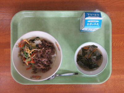 「福島牛」は「福島牛いため」として、ナムルといっしょにビビンバにして食べました(献立表には「おいしさ牛っとふくしまビビンバ」と書かれていました)。