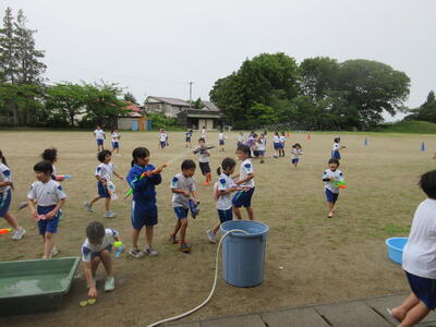 各自、家から持ってきた「水鉄砲」を使い、思いっきり遊びました。