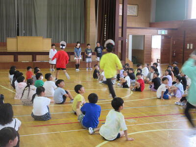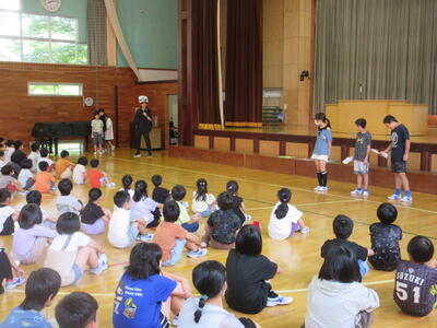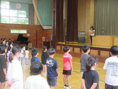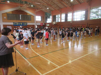 本日の全校朝の会は、給食委員会の表現活動を行いました。