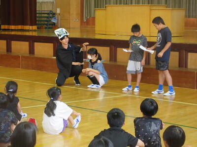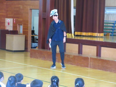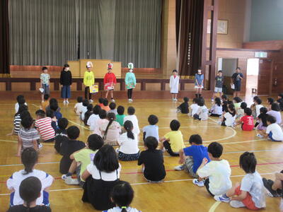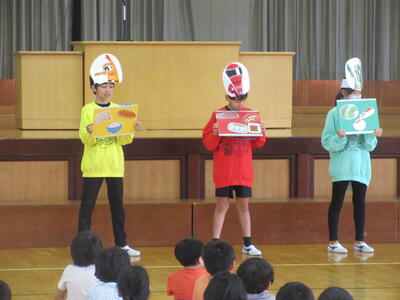 給食委員が寸劇で「バランスのよい食事」の大切さを発表しました。