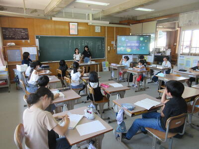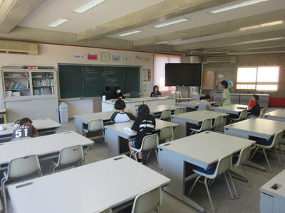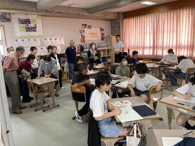 20名程度の人数でゆったりとした教室で学習していること、「学び合い」のためコの字型の座席や小グループになって学習していることに感心しておられました(昔は40~50名で前だけ向いて学習していた)。