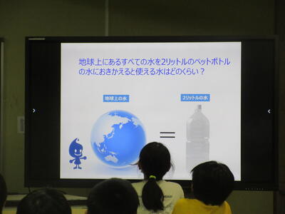 「165カ国のうち水道水が飲めるのはわずか9カ国だけ」「地球上のすべの水をペットボトルにたとえると、使える水はわずか一滴のみ」などの話には、子ども達から驚きの声が上がっていました。