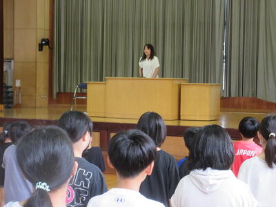 本日、全校朝の会の時間に、ひまわり学級担任の岩渕先生の離任式を行いました。