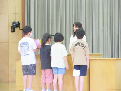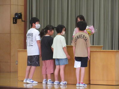 「お別れの言葉」を昨年度担任した5年児童が、「花束贈呈」をひまわり学級の児童が行いました。