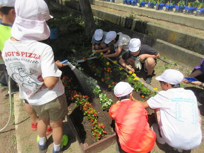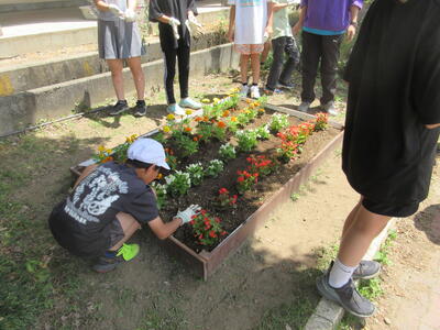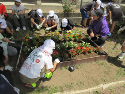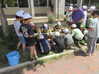 さっそく5年生が、5学年花壇に花苗を植えました。