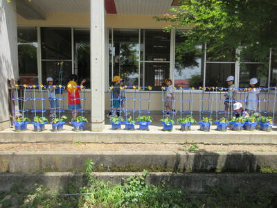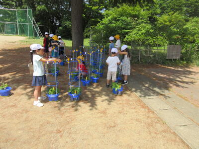 1年生は、自分でアサガオの鉢に支柱を立てました。