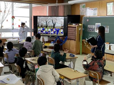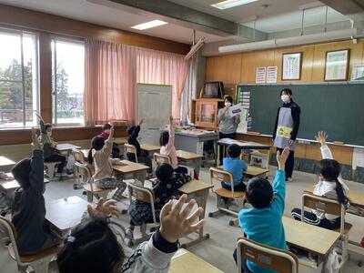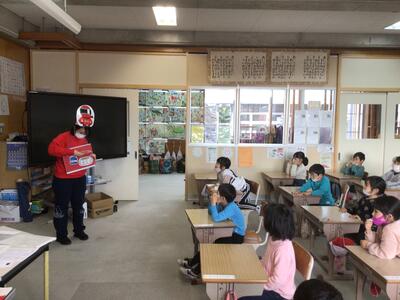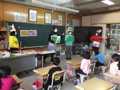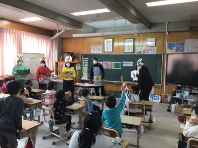 栄養教諭と担任の先生による1年生の食育授業で、かっこいいレンジャーが登場です