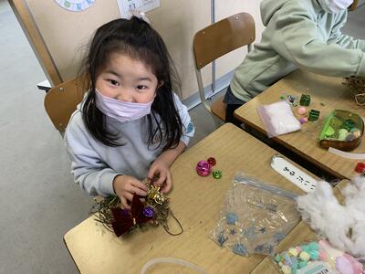 お家からもってきた飾りで、かわいらしく飾りつけをし、オリジナルのリースができあがりました