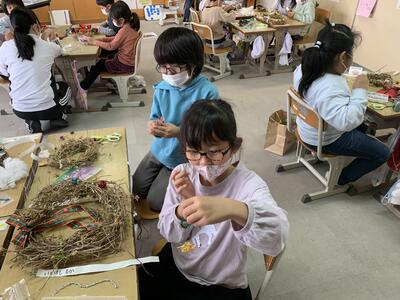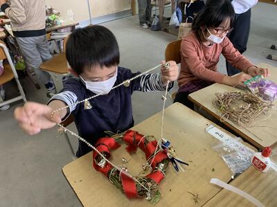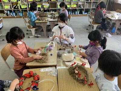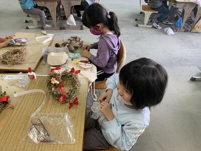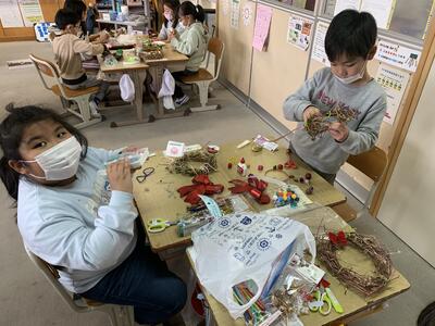 1年生が育てたアサガオのツルを使って、クリスマスリース作りを行いました