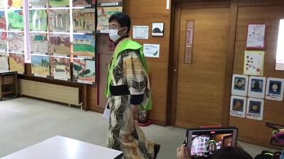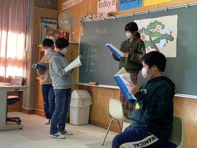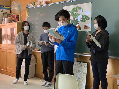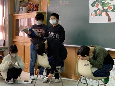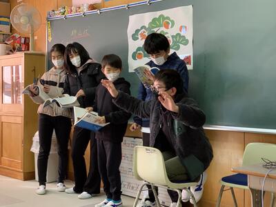 6年生が狂言「柿山伏」の音読劇に挑戦しました