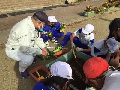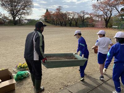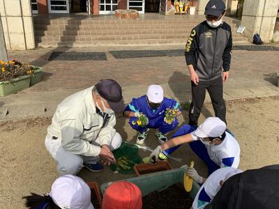 今日は6年生が人権擁護員の皆さんと一緒に、「人権の花」の植え付け活動を行いました