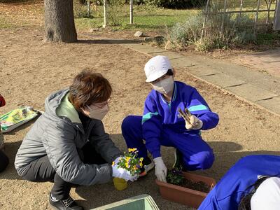 自分たちの手作りのプランターに花を添えて、お世話になっている事業所に届けにいきます