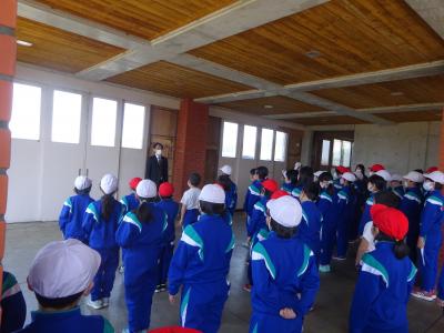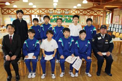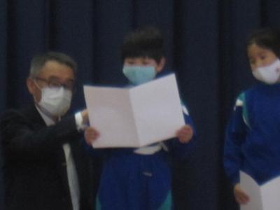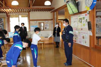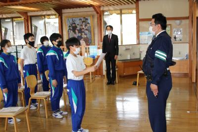 6年生の代表に委嘱状が手渡され「交通の決まりを守り、みんなのお手本になる」「車に乗ったら、シートベルトを着用する」「みんなに交通ルールを守ることを呼びかける」「自転車に乗るときにはヘルメットをかぶる」 などの宣言をしました。これから、交通安全推進委員として、命を守る為の行動を実践してくれる事でしょう。