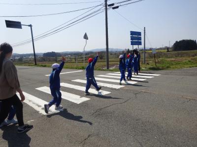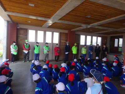 「今までの登下校の様子は花丸さらに安全に歩行するためには『しっかりと自分の目で見て確認をする』『道路を渡るときは手をあげる』に取り組もう!」交通安全教室での校長先生のお話の一部です。