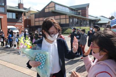 最後は、在校生みんなでお見送りです。「6年生、今までありがとう。」「たまには、遊びに来てください。」