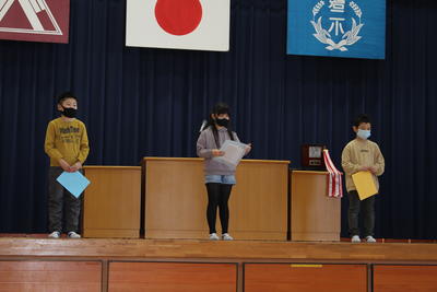 学年代表者による2学期の振り返りの発表では、学習面や生活面で頑張ったことやできるようになったこと、また、さらに3学期も継続して頑張りたいこと等を堂々と発表することができました。