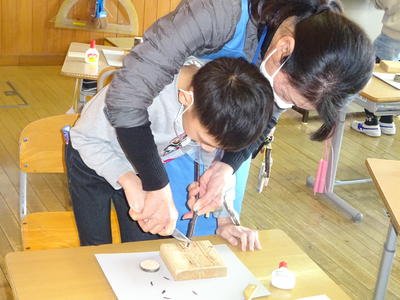 森の案内人の方に教えていただきながら、2・3年生が木工作品の制作をしました。のこぎりやなた、ナイフなど、今まで使ったことのない道具を使いながら、自分なりの作品を作っていました。