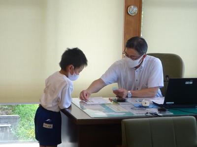 校長先生に合格シールをもらった1年生は満点の笑顔!