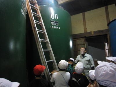 作ったお酒を入れておくタンクの大きさにびっくり!なんと、5000リットルも入るそうです。もっと大きなタンクもありました。「酒蔵の入り口よりも大きなタンクを、どうやって入れたと思う?」と聞かれ、子どもたちは、「地面を掘って入れたのかな?屋根を外して入れたのかな?」と頭をひねっていました。正解は、「壁をこわして入れた」だそうです。