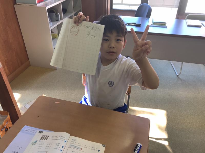九九のどの段を使うか考え・・・繰り上がる数に気をつけ・・・丁寧に解いていきます。