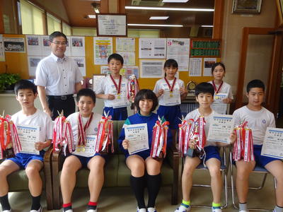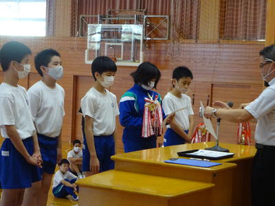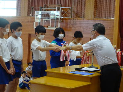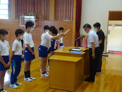 今日の全校朝の会では、8月27日に行われた「校内水泳記録会」の表彰がありました。50m以上の種目での第1位には、トロフィーが授与されました。歴代のペナントには、子どもたちのお父さんやお母さんの名前も!今年の優勝者も、見事に立派な足跡を残しました。