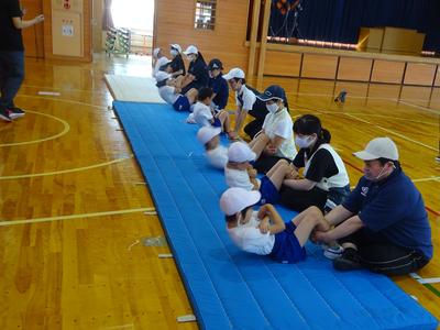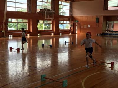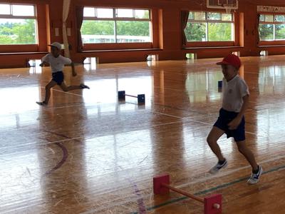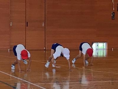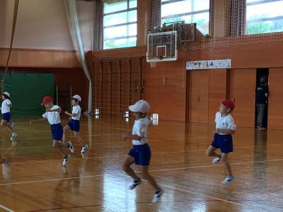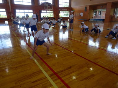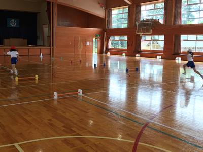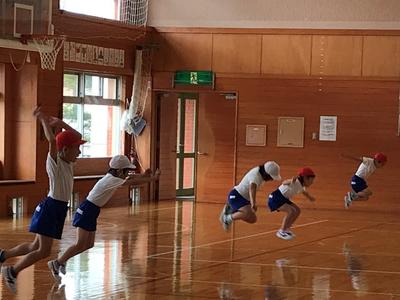 「1・2・3!」のリズムに合わせて思いっきりジャンプしたかと思えば,片足ケンケン跳びで体育館の端まで行ったり,犬のように四足歩行で素早く走ったり・・・。全身を使ってきびきびと動いていました。