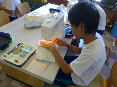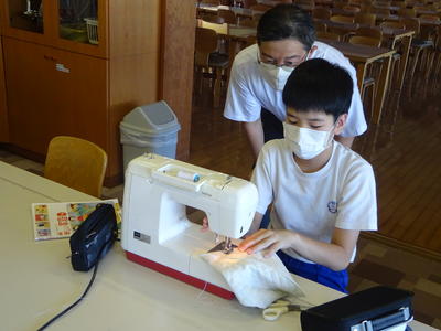 6年生の家庭科の授業、ミシンを使っての作品作りです。
