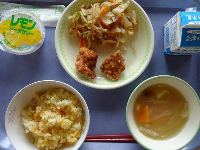 今日の給食の献立は「にんじんご飯、鶏肉の唐揚げ、キャベツのおかか和え、具だくさん汁、レモンゼリー、牛乳」でした。