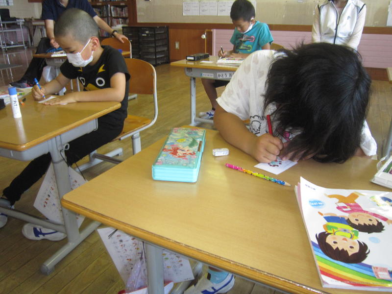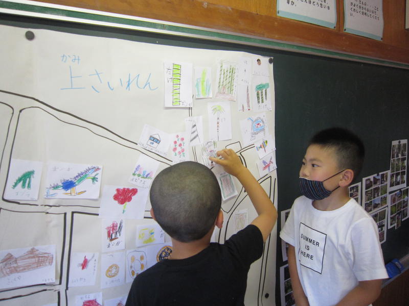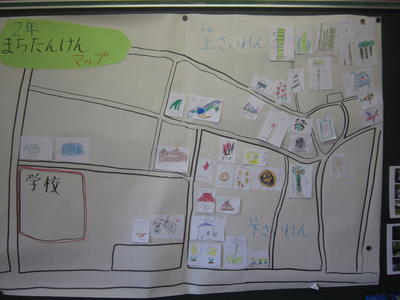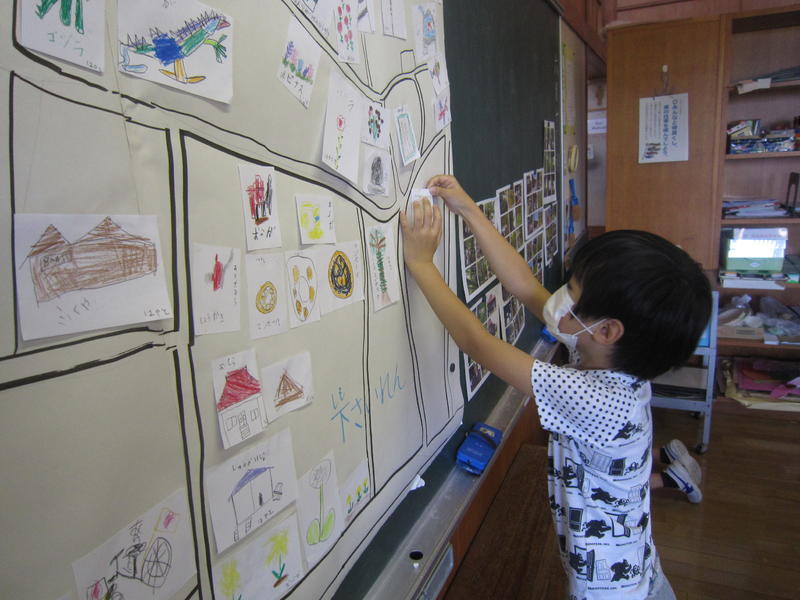 先週のまちたんけんから1週間。今日は探検で見つけたものを絵に描き、地図に貼り付けて、まちたんけんマップづくりをしました。