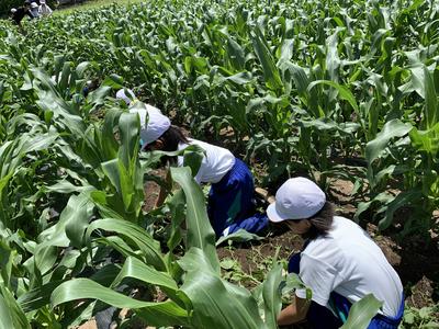 今回は、トウモロコシの栄養を守るためにみんなで草むしりのお手伝いもしました。